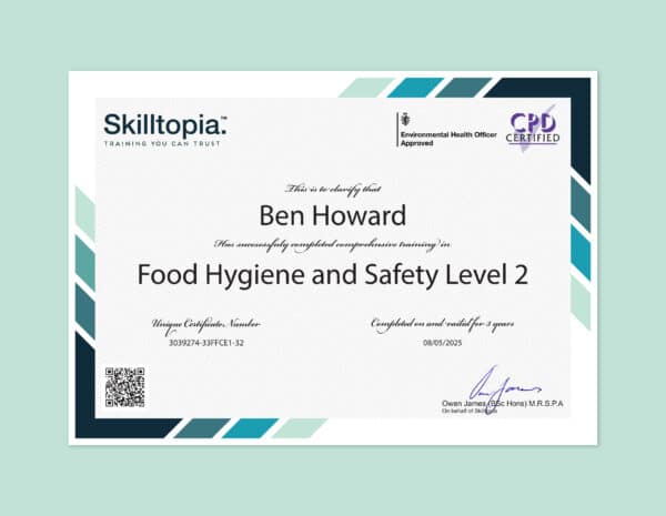 As a catering business owner, I needed a Food Hygiene Level 2 Course that was both comprehensive and flexible, and this one delivered on every front. The modules covered critical topics like food safety laws, contamination prevention, and allergen awareness with incredible clarity. The platform was intuitive, and the ability to pause and resume lessons was perfect for my busy days. The final exam was well-structured, and the instant certificate download was a nice touch. I’ve recommended this to all my staff and colleagues!
