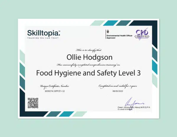 This course is perfect for anyone in a supervisory role. Skilltopia’s Food Hygiene Level 3 is comprehensive, and the website is seamless. Worth every penny for the quality!